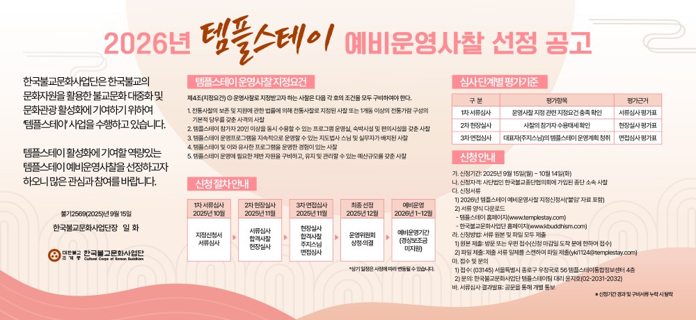 2026년 템플스테이 예비운영사찰 선정 공고문[9.15-10.14]